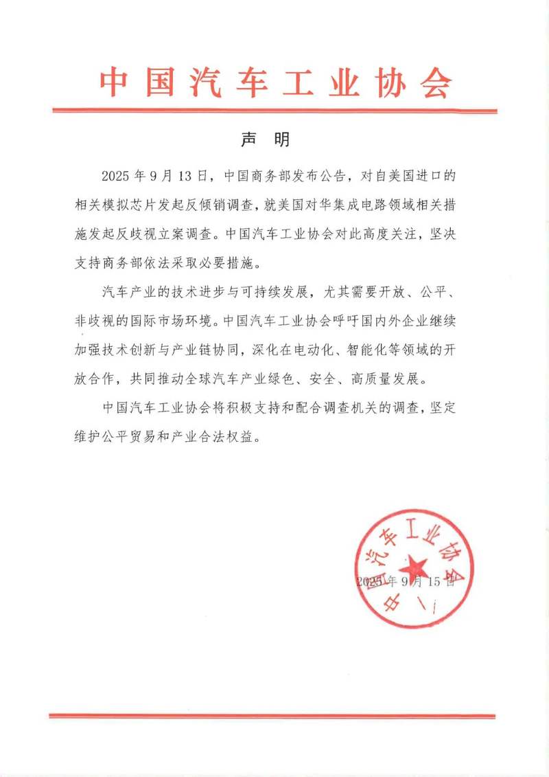 中国汽车制造商协会的官方WYBO于9月16日发布了《北京新闻》。全文如下:2025年9月13日,中国商务部宣布了一份广告,宣布对从美国进口的相关模拟芯片进行抑制调查,并将相关的集成集成集成集成的相关集成量调查启动。中国汽车制造商协会正在非常关注这一点,并坚决支持商务部根据法律采取必要的措施。汽车行业的技术进步和可持续发展需要特别开放,公平和非歧视性的国际市场环境。中国汽车制造商协会要求国家和外国公司继续加强技术创新与工业连锁店之间的协调,这加深了TH的开放合作E电气化和智能领域,并共同促进了全球汽车行业的绿色,安全和高质量的发展。中国汽车制造商协会积极支持并合作研究研究机构的调查,以确保保护公平贸易,合法的权利和利益。编辑Mao Tianyu