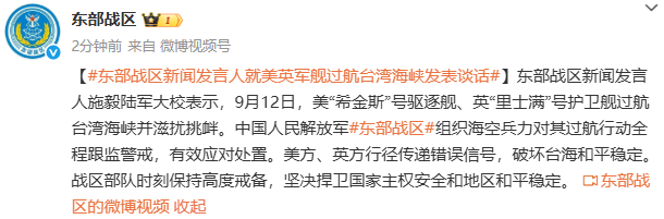 东部剧院司令部发言人是北京新闻东部剧院司令部的官方博客的发言人,9月12日说,希金斯号号航空母舰和英国护卫舰的驱逐舰已经穿过台湾海峡并诱使他们。大众解放军的东剧院司令部组织,有效地做出了反应,并与海军和空军打交道,以继续在整个过程中继续监督的transhipdo行动。美国和英国的行动发出了破坏台湾海峡和平与稳定的虚假信号。戏剧力量始终保持警惕,决心捍卫国家主权,安全与和平与地方稳定。编辑李Yilinzi