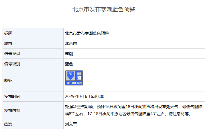 北京因寒冷天气发布蓝色预警 – 新京报 首页每日更新 在 每日更新 2025年10月18日 0 新京报讯 据北京市气象局网站消息,北京已发布寒潮蓝色预警:受较强冷空气影响,预计16日夜间至18日北京将出现寒潮。最低气温将下降8℃左右。 17日夜间至18日,平原最低气温将降至4℃左右。注意预防措施。编辑 申真 发表回复 取消回复您的邮箱地址不会被公开。 必填项已用 * 标注评论 * 显示名称 * 邮箱 * 网站 在此浏览器中保存我的显示名称、邮箱地址和网站地址,以便下次评论时使用。 作者 相关文章 在 每日更新 曲江文旅减持一家子公司 资产出售业绩仍亏损_新京报 2025年10月27日 0 新京报贝壳财经讯(记者 王真真)10月24日... 读出全部 在 每日更新 美国9月消费者价格指数环比上涨0.3%,同比上涨3% – 新京报 2025年10月26日 0 据央视新闻报道,当地时间10月24日,美国劳... 读出全部 在 每日更新 松阳动力推出万元以下仿人机器人 有望提升机器人人气 – 新京报 2025年10月25日 0 新京报贝壳财经讯(记者 张涵)10月22日,... 读出全部 在 每日更新 国资委举办2026年市属企业大学毕业生秋季校园招聘会 – 新京报 2025年10月24日 0 新京报贝壳财经讯(记者 张晓忠)10月23日... 读出全部 在 每日更新 西城市拥有23辆公共学习巴士,覆盖全区1400余名学生 – 新京报 2025年10月23日 0 新京报讯 据官方微信“北京西城”消息,西城区... 读出全部 在 每日更新 57家新加坡企业将参展第八届中国国际进口博览会 携手实现可持续发展 – 新京报 2025年10月23日 0 新京报贝壳财经讯(记者 杨霞)10月22日,... 读出全部 文章导航 上篇文章下篇文章